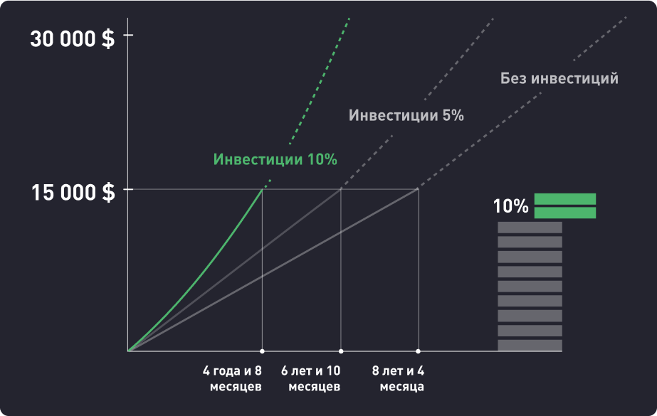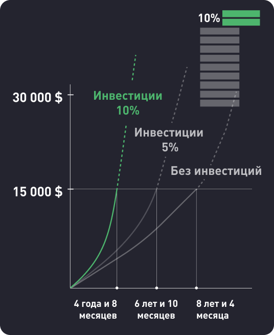 С помощью инвестиций вы сможете быстрее достигать финансовых целей, покрывая часть расходов за счет роста капитала. Без ипотеки. Без кредитов. Без долгов.